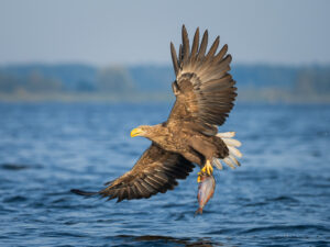 Rejs łodzią pozwala na wykonanie bardziej dynamicznych i ciekawszych zdjęć bielików od tych, jakie można zrobić na lądzie z czatowni. Bieliki polujące na ryby, pikujące do wody, łapiące ofiarę czy unoszące się nad wodą z rybą w szponach – to tylko niektóre z kadrów, jakie mamy okazję wykonać. Z doświadczenia wiem jednak, że nie jest to łatwe zadanie – szczególnie na początku. Akcja zazwyczaj jest bardzo dynamiczna, a zrobienie zdjęcia wymaga skoordynowania w tym samym czasie kilku elementów. Sukces potrafi szybko wynagrodzić wszelkie niepowodzenia.